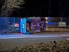 En personbil ligger på siden og der er ankommet en ambulance til stedet.