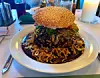 Det siges, at førstehåndsindtrykket er vigtigt. Og indtryk giver bøfsandwichen, da den står på bordet. Man kan vel bedst beskrive den som en sovsevulkan med lava af ristede løg – på toppen en sky af en halv sesambolle. Den er både imponerende og afskrækkende på samme tid. Men smages, det skal den. Skal der være plads til de medfølgende råstegte kartofler, er det da også bare at sætte i gang.