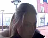 B: Kvinde, almindelig af bygning, lyst hår sat op i hestehale. Hun har været iført en sort jakke med pelskrave, stribet trøje under jakken, mørkeblå cowboybukser og sorte sko med hvid kant.