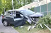 Bilen kørte ind i metalhegnet, hvor flere stolper knækkede og blev slynget gennem luften.